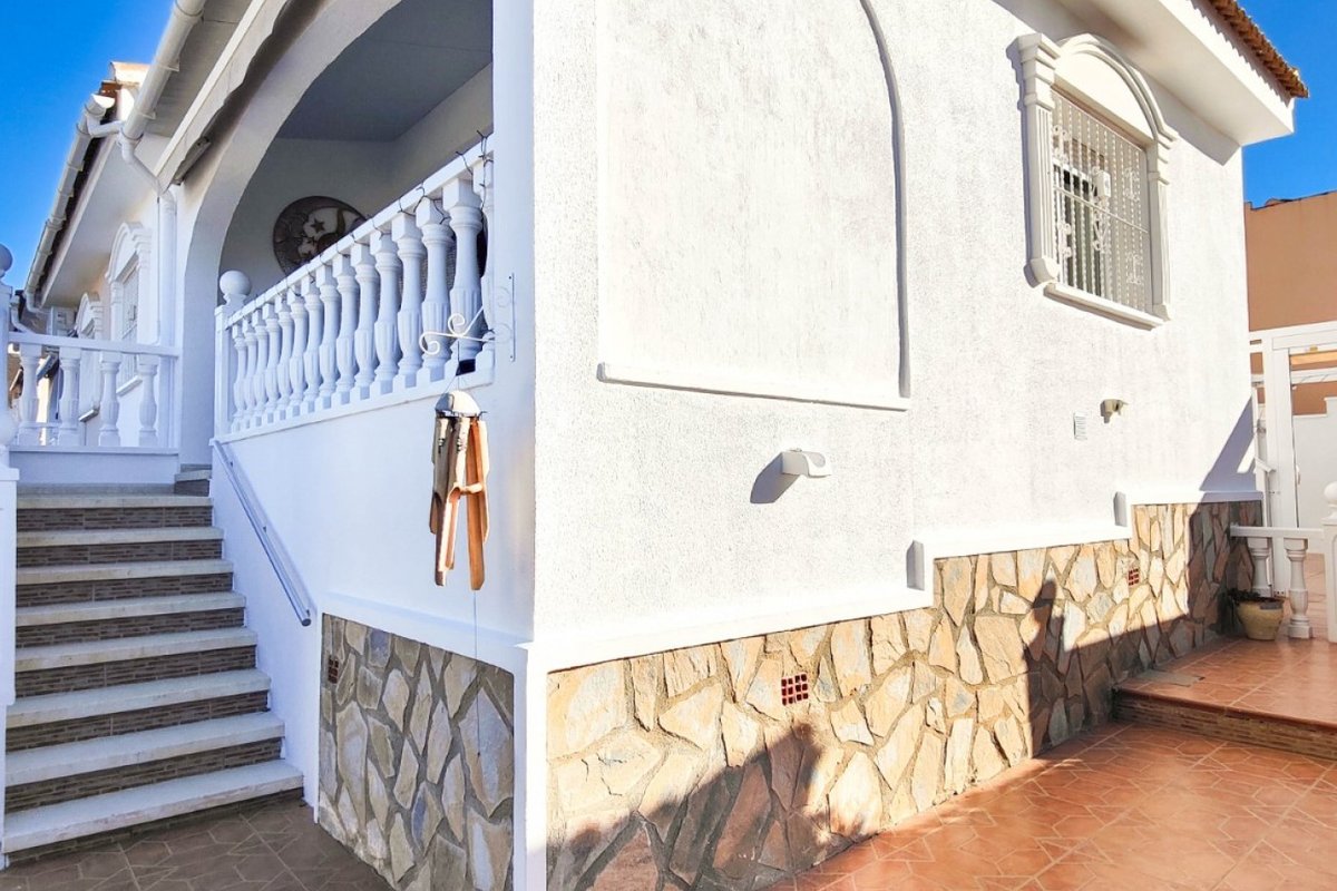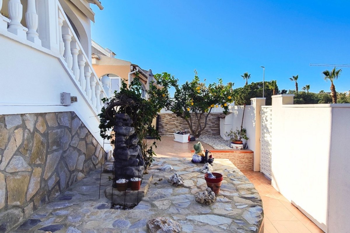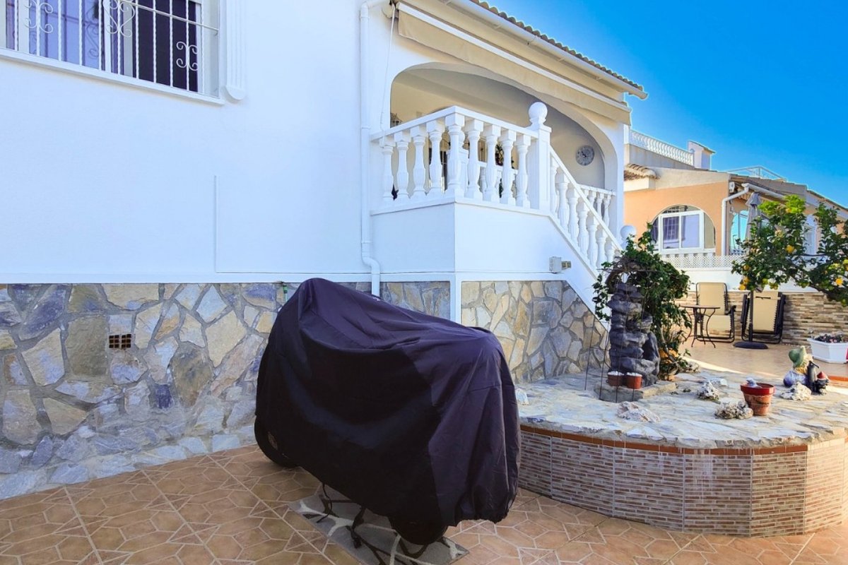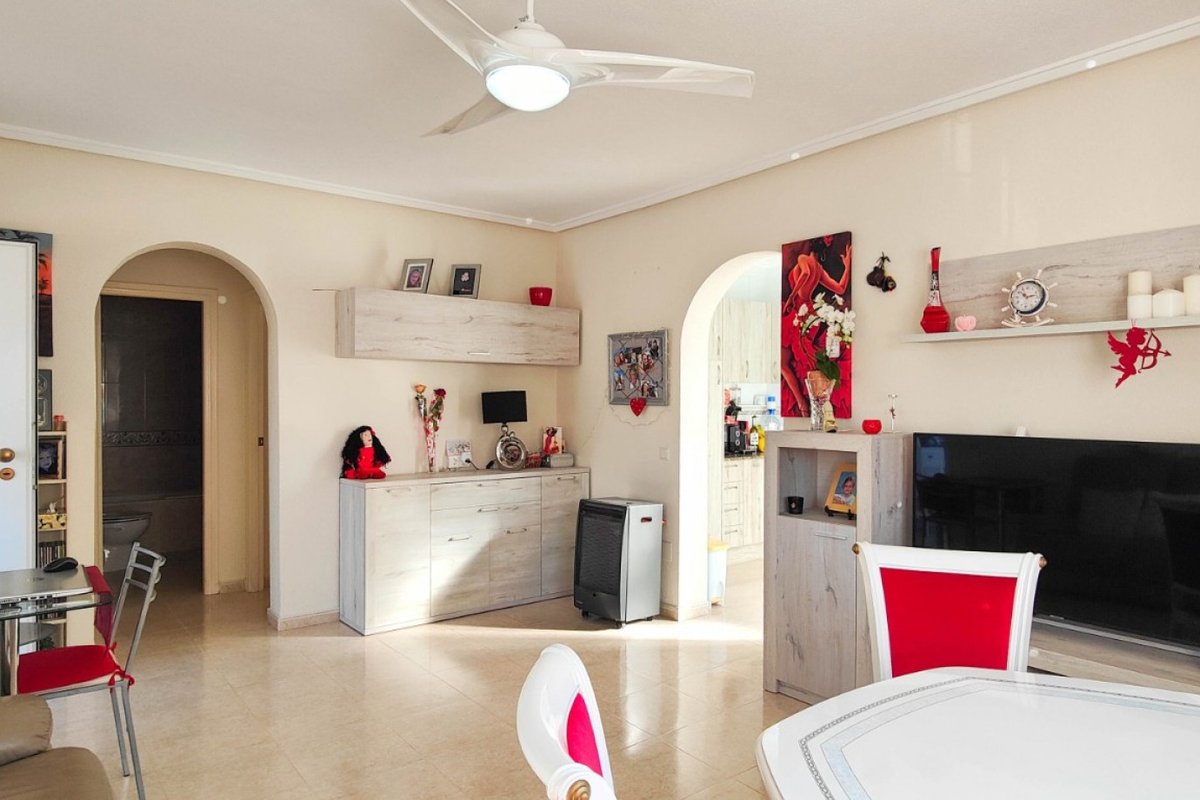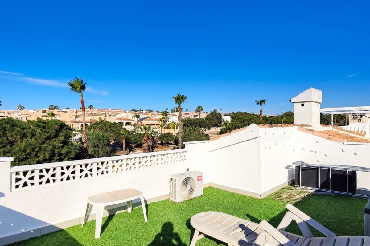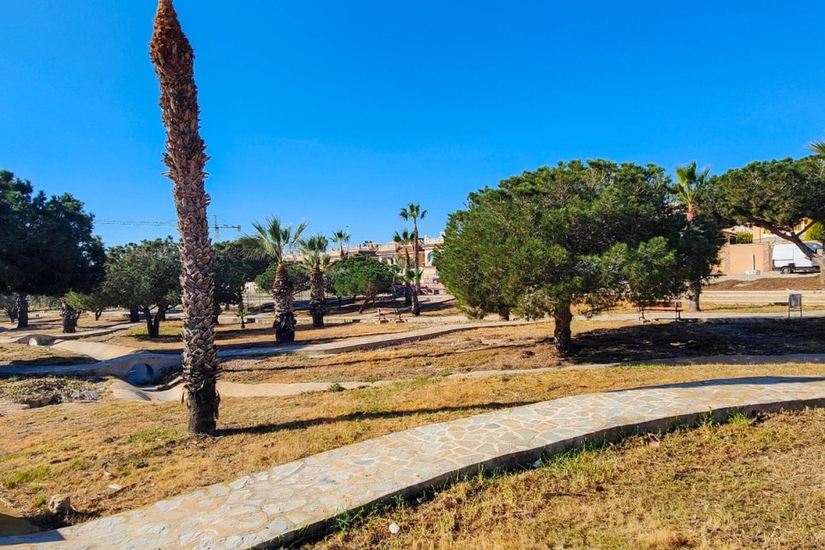 This beautiful semi-detached villa is located on a 200 m² plot in a quiet and highly sought-after area of Ciudad Quesada, part of Rojales. Positioned directly in front of a spacious green area, the property enjoys completely open views, excellent privacy and a peaceful environment. The villa is distributed entirely on one level and is elevated with an air chamber underneath, providing improved insulation and comfort throughout the year. It offers 2 bedrooms with fitted wardrobes and 2 full bathrooms, one of them en-suite. The living room is spacious and filled with natural light thanks to its west orientation, and it is equipped with air conditioning. All rooms benefit from ceiling fans. The kitchen is independent and fully equipped. Outside, the property features a private garden of approximately 100 m², ideal for enjoying the Mediterranean climate, as well as a 15 m² west-facing porch overlooking the green area. There is also a 20 m² private solarium, perfect as a relaxation space, off road parking for the car, and a storage/laundry room. The facade and exterior walls have been recently painted, and the property is sold furnished, including white goods. The residential complex offers a communal swimming pool. Located close to the centre of Ciudad Quesada, with all amenities, shops and restaurants within easy reach. An excellent opportunity as a permanent residence, holiday home or investment property on the Costa Blanca South.