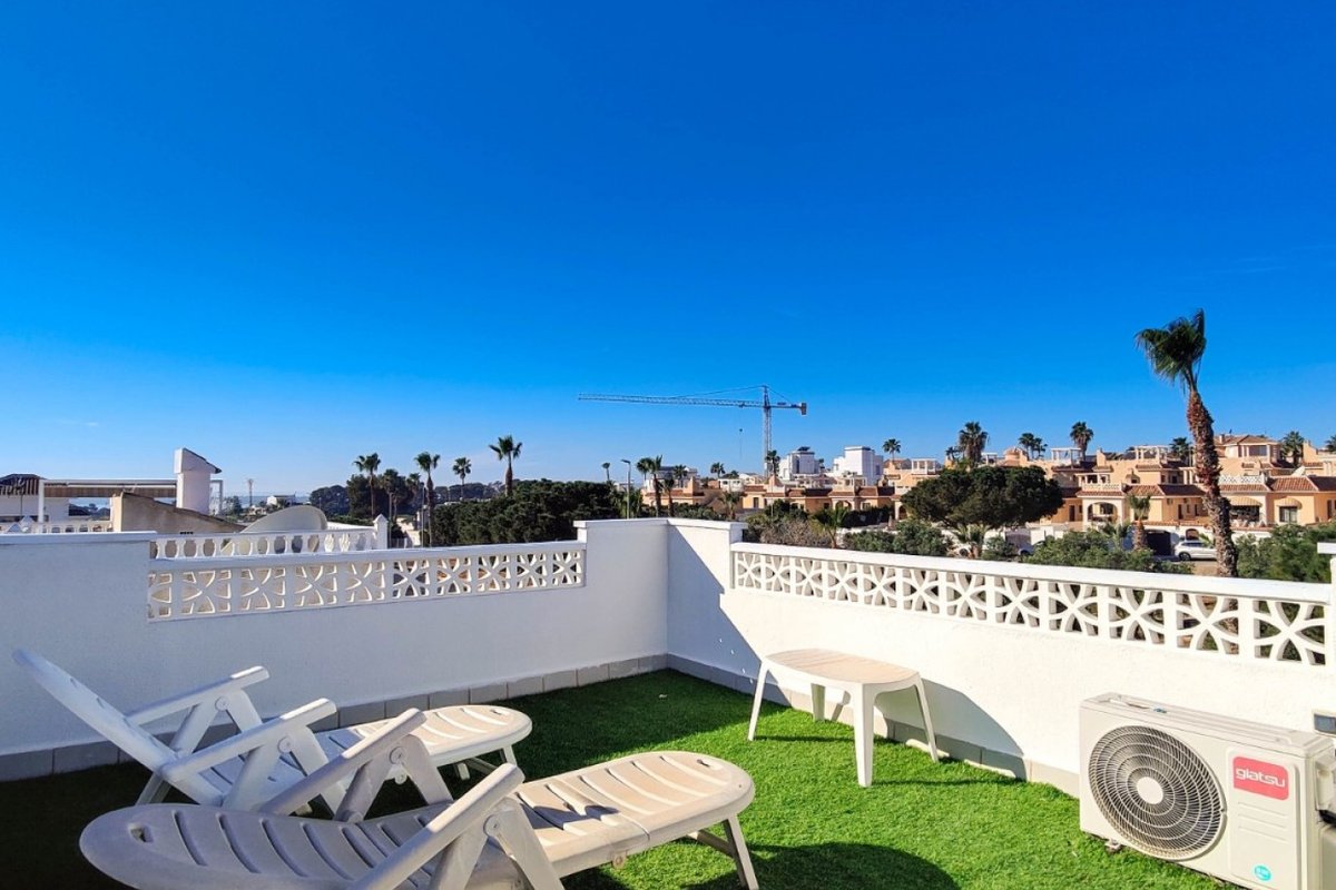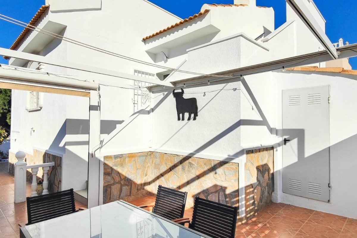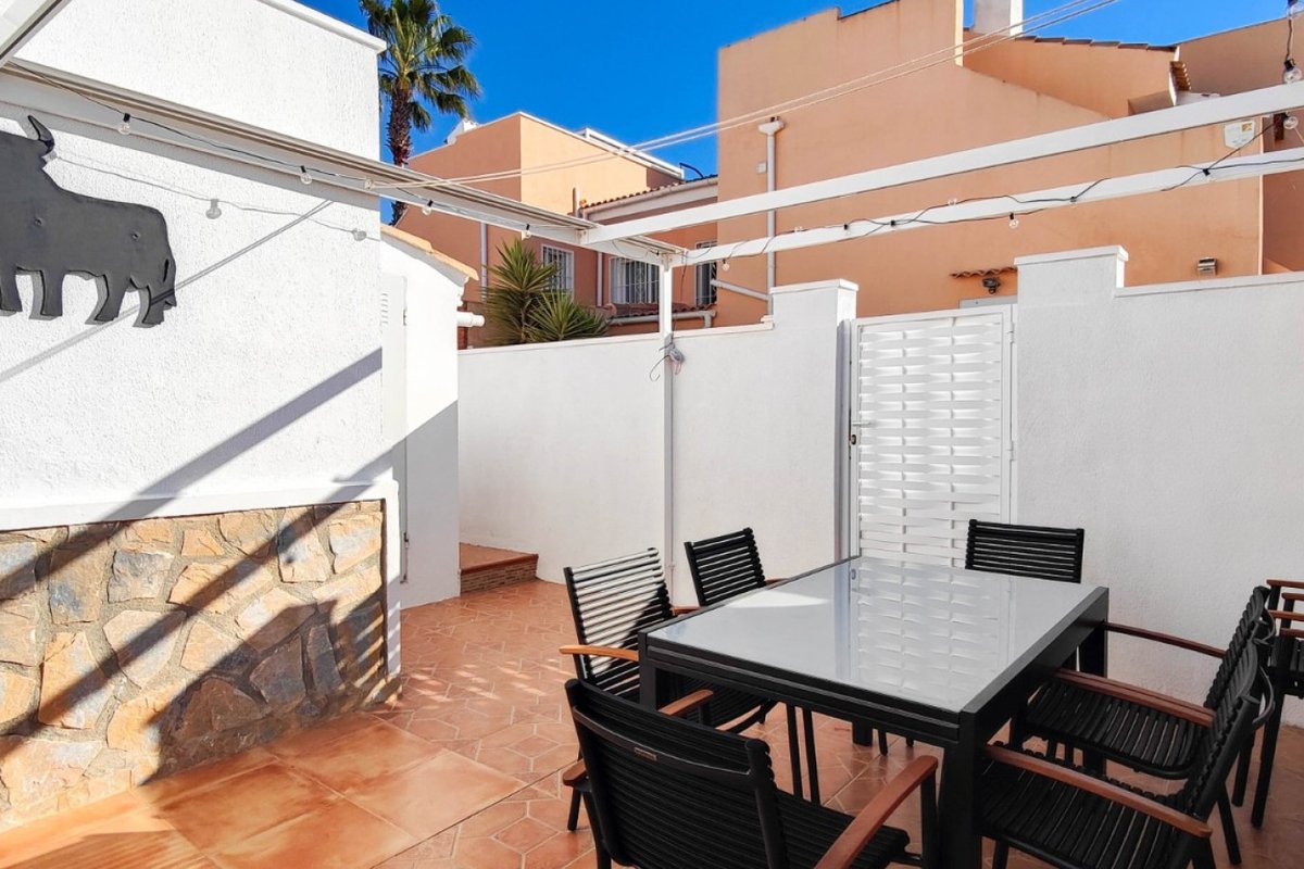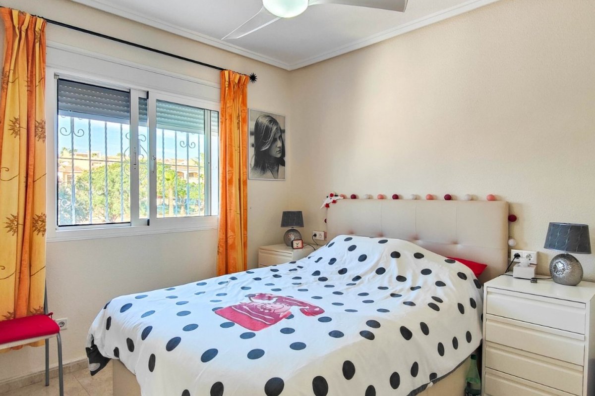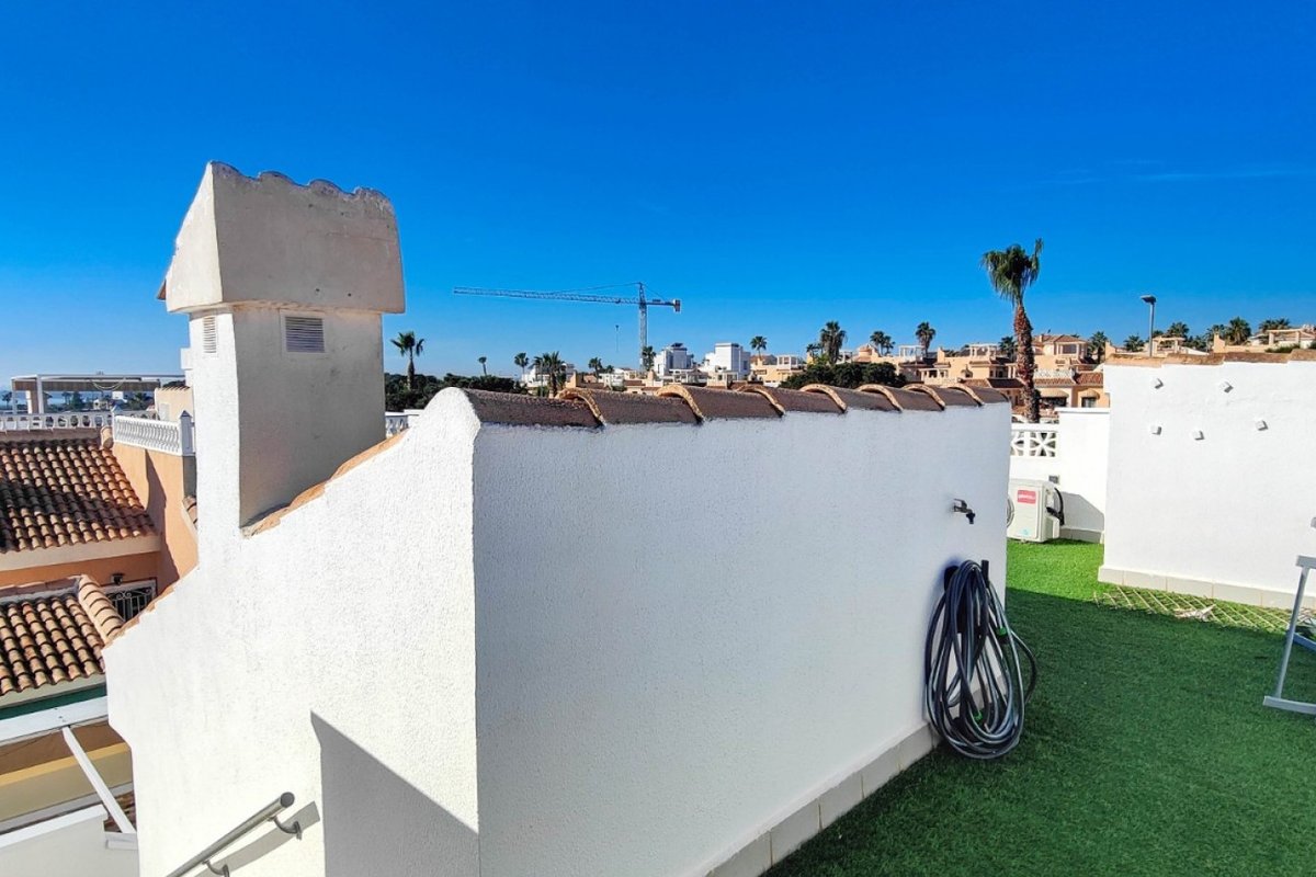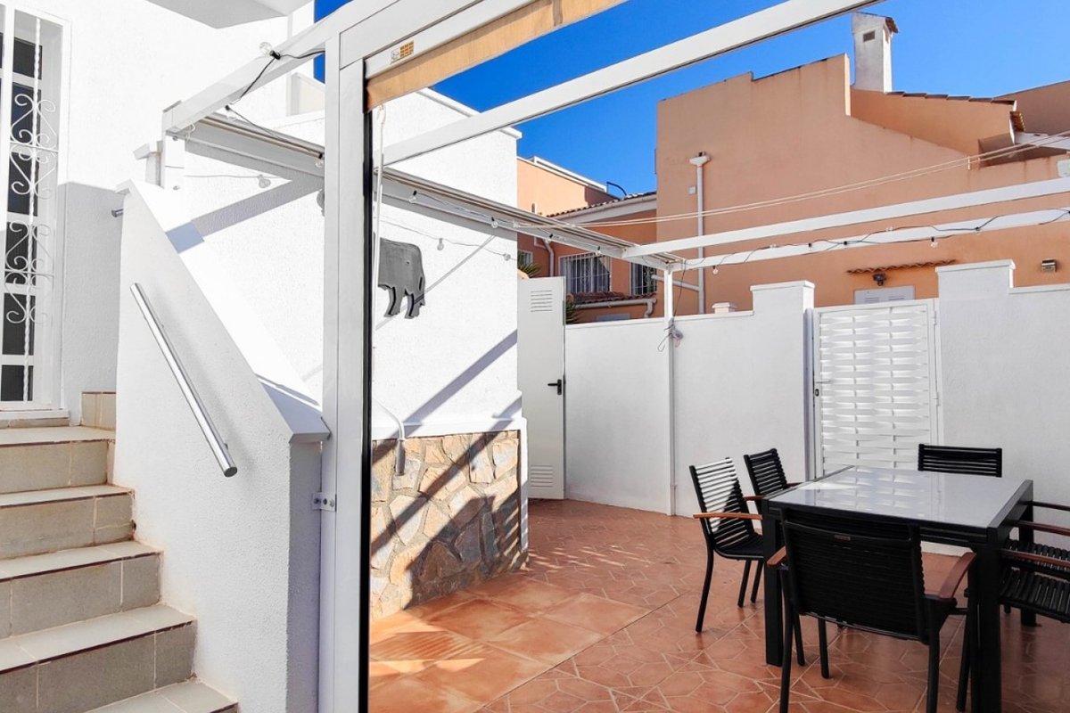 This beautiful semi-detached villa is located on a 200 m² plot in a quiet and highly sought-after area of Ciudad Quesada, part of Rojales. Positioned directly in front of a spacious green area, the property enjoys completely open views, excellent privacy and a peaceful environment. The villa is distributed entirely on one level and is elevated with an air chamber underneath, providing improved insulation and comfort throughout the year. It offers 2 bedrooms with fitted wardrobes and 2 full bathrooms, one of them en-suite. The living room is spacious and filled with natural light thanks to its west orientation, and it is equipped with air conditioning. All rooms benefit from ceiling fans. The kitchen is independent and fully equipped. Outside, the property features a private garden of approximately 100 m², ideal for enjoying the Mediterranean climate, as well as a 15 m² west-facing porch overlooking the green area. There is also a 20 m² private solarium, perfect as a relaxation space, off road parking for the car, and a storage/laundry room. The facade and exterior walls have been recently painted, and the property is sold furnished, including white goods. The residential complex offers a communal swimming pool. Located close to the centre of Ciudad Quesada, with all amenities, shops and restaurants within easy reach. An excellent opportunity as a permanent residence, holiday home or investment property on the Costa Blanca South.