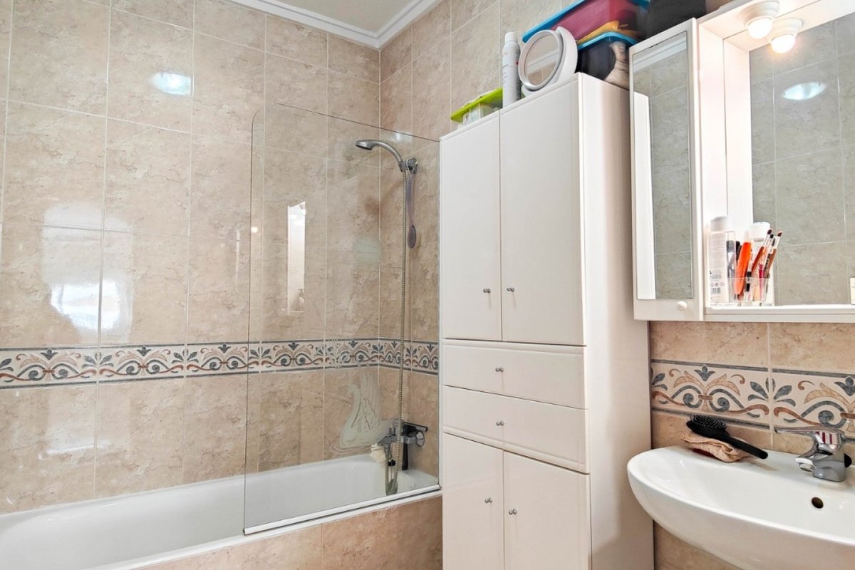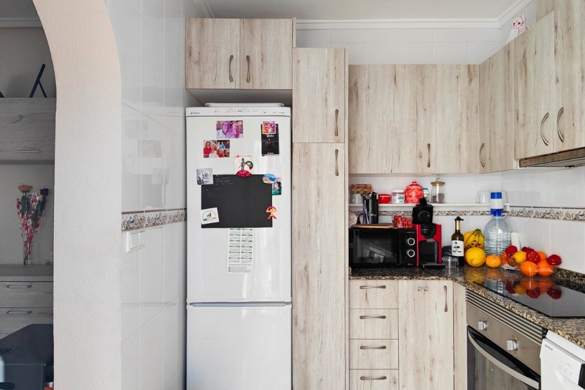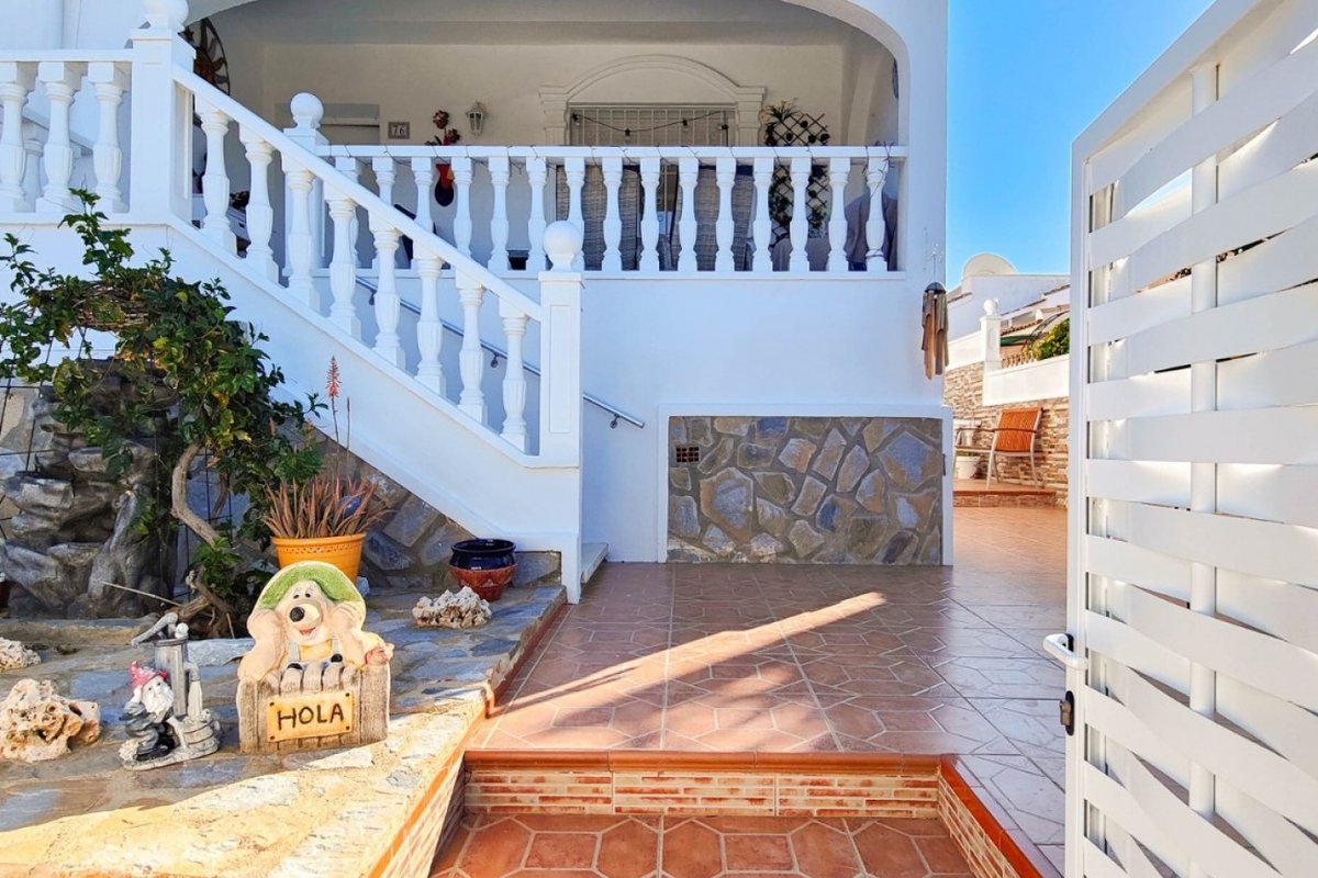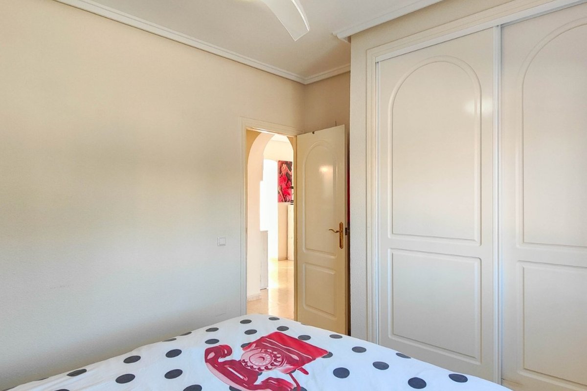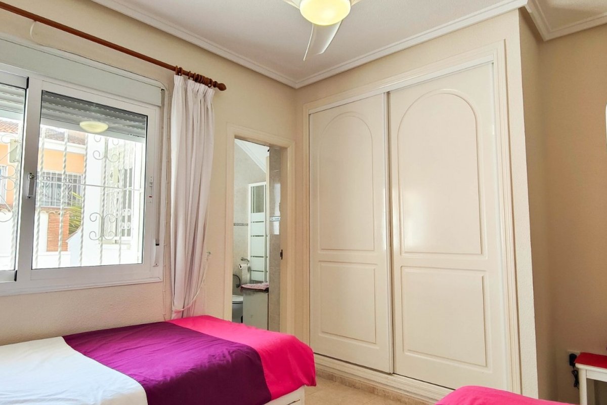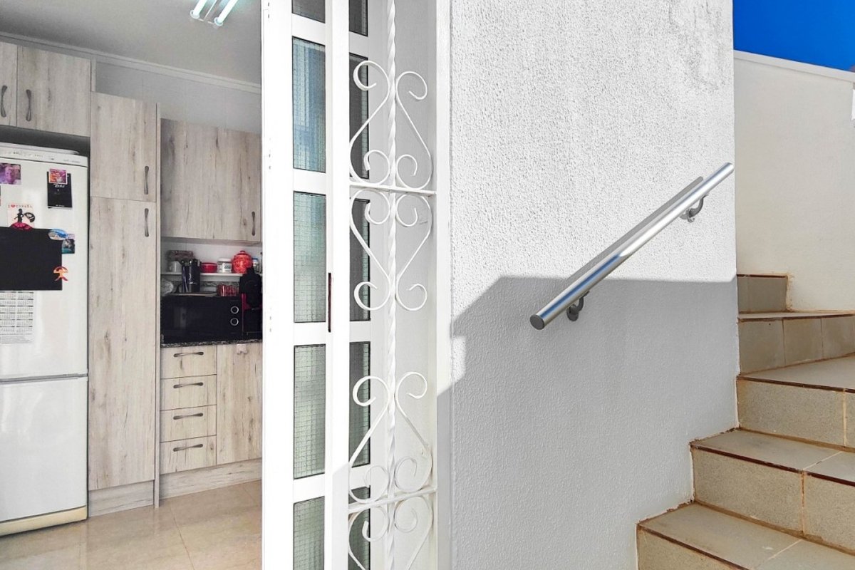 This beautiful semi-detached villa is located on a 200 m² plot in a quiet and highly sought-after area of Ciudad Quesada, part of Rojales. Positioned directly in front of a spacious green area, the property enjoys completely open views, excellent privacy and a peaceful environment. The villa is distributed entirely on one level and is elevated with an air chamber underneath, providing improved insulation and comfort throughout the year. It offers 2 bedrooms with fitted wardrobes and 2 full bathrooms, one of them en-suite. The living room is spacious and filled with natural light thanks to its west orientation, and it is equipped with air conditioning. All rooms benefit from ceiling fans. The kitchen is independent and fully equipped. Outside, the property features a private garden of approximately 100 m², ideal for enjoying the Mediterranean climate, as well as a 15 m² west-facing porch overlooking the green area. There is also a 20 m² private solarium, perfect as a relaxation space, off road parking for the car, and a storage/laundry room. The facade and exterior walls have been recently painted, and the property is sold furnished, including white goods. The residential complex offers a communal swimming pool. Located close to the centre of Ciudad Quesada, with all amenities, shops and restaurants within easy reach. An excellent opportunity as a permanent residence, holiday home or investment property on the Costa Blanca South.