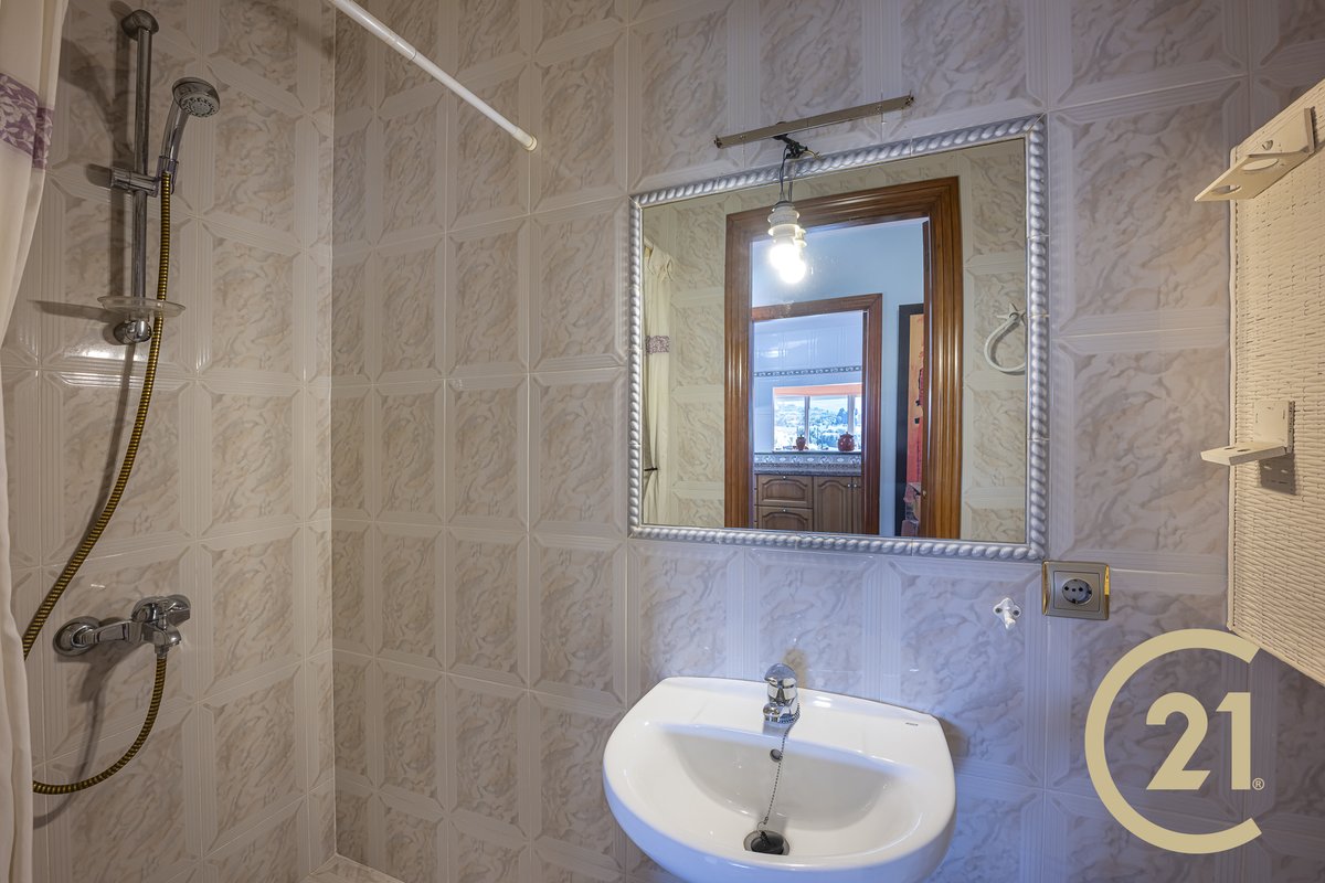 La vivienda principal se sitúa en la planta de arriba y destaca por su luminoso salón, que incluye una zona de comedor y acceso a un balcón. Desde aquí, se puede acceder a una amplia terraza, perfecta para disfrutar del aire libre. La cocina es independiente y está integrada en el salón mediante una barra, lo que fomenta un ambiente social y acogedor.