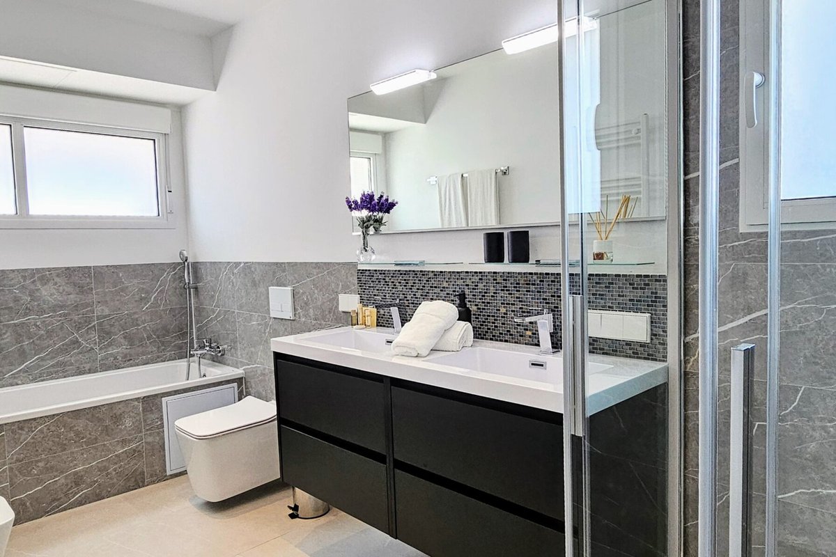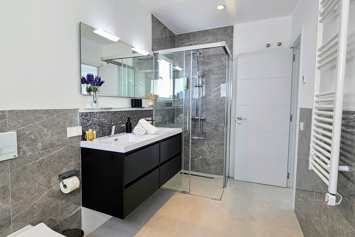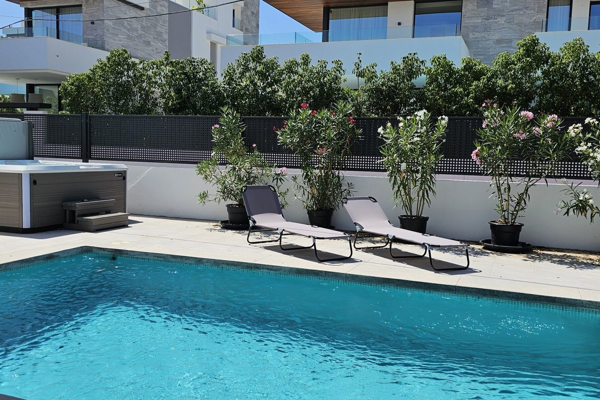 Inside, every detail has been curated with neutral tones and great finishes, complemented by sustainable features such as solar panels covering 70% of energy needs. The rooftop terrace invites a glimpse of sea views and lovely sunset views, while the private garden with pool and jacuzzi offers a serene retreat just moments from the sea.