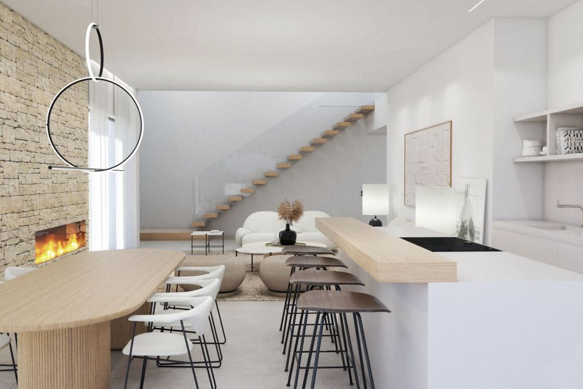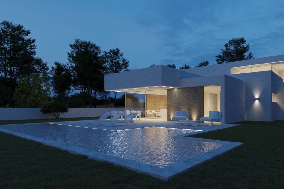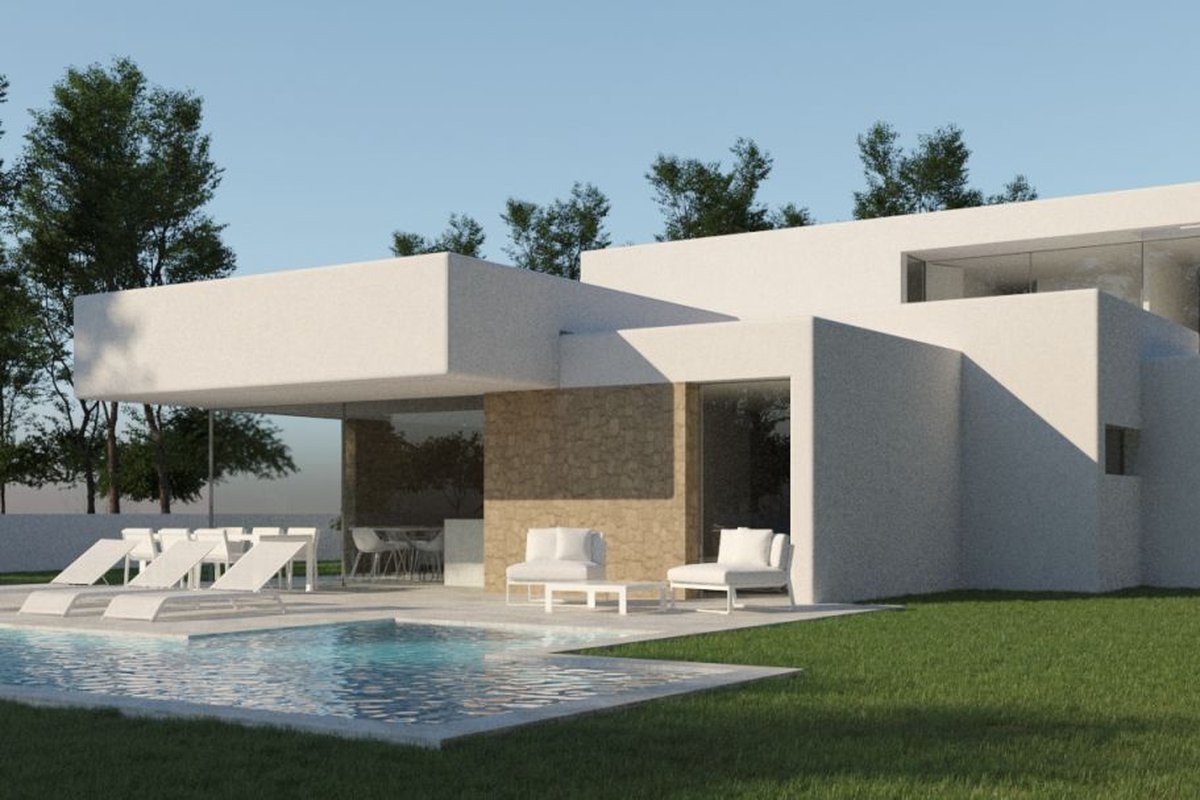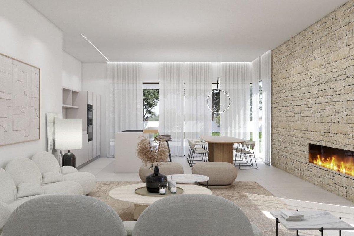 Just 1.5 km from the town center of Moraira and its sandy beaches, we find this south-facing project under construction on a 891m² plot with views of the sea, the valley and the town. br br ~ The house has a total area of 268.96 m2.br br ~The construction of modern lines has large windows in all rooms that allow the entry of abundant natural light and at the same time connects with the exterior spaces. br br Built on two levels, it is distributed as follows: br br ~- 4 bedrooms with their corresponding bathrooms en suite, cozy living room with fireplace and dining room, kitchen equipped with quality furniture, 1 courtesy toilet and a laundry room. br br ~From the living room there is access to a semi-covered terrace next to the solarium and a 3 x 10 m pool,~The master suite has its own terrace. br br ~The garage has capacity for 2 cars. br br ~As for the garden, we offer a sustainable and low-maintenance proposal, using mainly native plants, as well as a design that respects the environment. The garden is designed so that there is coherence between the spaces, nature and the villa so that the wonderful climate of the area can be enjoyed both outside and inside the house.br br ~With regard to air conditioning, it is equipped with an aerothermal system: underfloor heating, ducted air conditioning, centralized ventilation, zone control.~An alarm system is also included.~