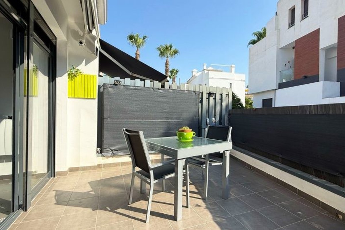 The development offers a beautiful communal swimming pool surrounded by natural grass , located just 30 meters from the property , and the plot even allows for the possibility of building a private pool . Its location is unbeatable: surrounded by restaurants, bars, supermarkets (such as Mercadona) and very close to the prestigious Campoamor and Villamartín golf courses .