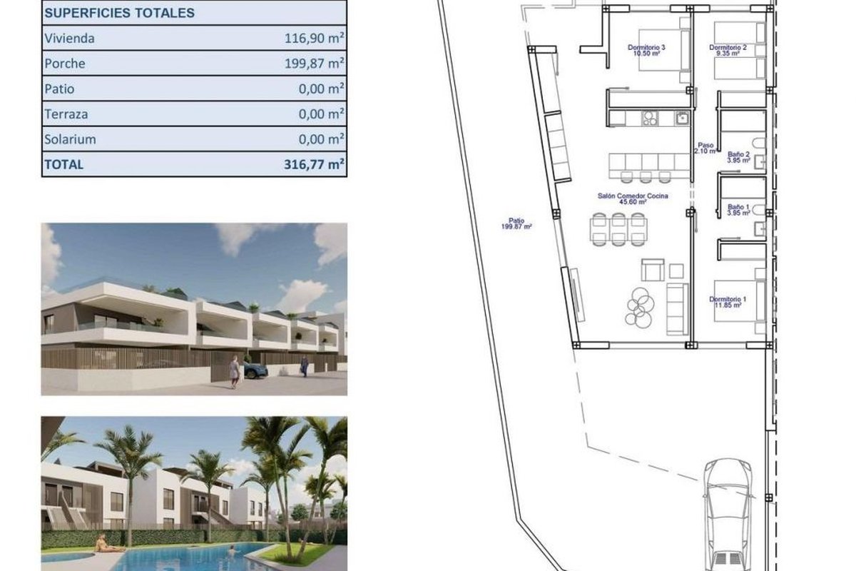 New Build Apartments and Bungalows for Sale in Pilar de la Horadada Near the BeachExclusive Residential Development on the Southern Costa BlancaDiscover this modern new build residential complex located in Pilar de la Horadada, the southernmost town on the Costa Blanca. This boutique development offers a selection of contemporary apartments and bungalows designed to combine comfort, functionality and Mediterranean lifestyle.The project consists of only 26 carefully designed homes with 2 or 3 bedrooms and 2 bathrooms, making it an ideal option for both permanent residence and holiday living. The complex is located in a quiet residential area within walking distance of the town center, where residents can enjoy restaurants, cafes, supermarkets, local shops and all essential services.Pilar de la Horadada is a charming Spanish town known for its welcoming atmosphere, lively main street and beautiful plazas. With excellent connections to nearby coastal areas and golf resorts, it is a popular destination for international buyers seeking sunshine and quality of life.Apartments and Bungalows with Private Outdoor SpacesThe development offers two different property types to suit various lifestyles.The complex includes 16 modern apartments. Buyers can choose between ground floor units with private gardens, middle floor apartments with spacious terraces or penthouses with private terraces and rooftop solariums. Each apartment includes a parking space and storage room in the underground garage.There are also 10 bungalows available. Ground floor bungalows feature private gardens and parking within the plot, while top floor bungalows offer terraces and private solariums. These upper level homes include parking and storage in the basement.All homes have been designed with bright interiors, open layouts and comfortable living areas that extend naturally to the outdoor spaces.Quality Construction and Modern FeaturesThe homes are built with high quality materials and modern systems to ensure comfort and energy efficiency throughout the year.Furnished kitchensFully equipped bathrooms with shower screens and underfloor heatingEnergy efficient aerothermal hot water systemPre installation for ducted air conditioningResidents also benefit from a communal swimming pool surrounded by landscaped gardens and sunbathing areas, creating a relaxing environment to enjoy the Mediterranean climate.Excellent Location Close to Beaches and GolfThe development enjoys a strategic location close to some of the best beaches and golf courses in the region.Torre de la Horadada beach 3 kmMil Palmeras beach 3 kmLo Romero Golf 6 kmRegion de Murcia International Airport 45 kmAlicante Elche Airport 75 kmThe area also offers excellent road connections to nearby coastal towns, marinas and leisure facilities along both the Costa Blanca and Costa Calida.Find Your New Home in Pilar de la HoradadaThis attractive new build residential complex offers modern homes, quality finishes and a fantastic location close to the beach. Contact us today for more information or to arrange a visit and secure your new property on the Costa Blanca.~